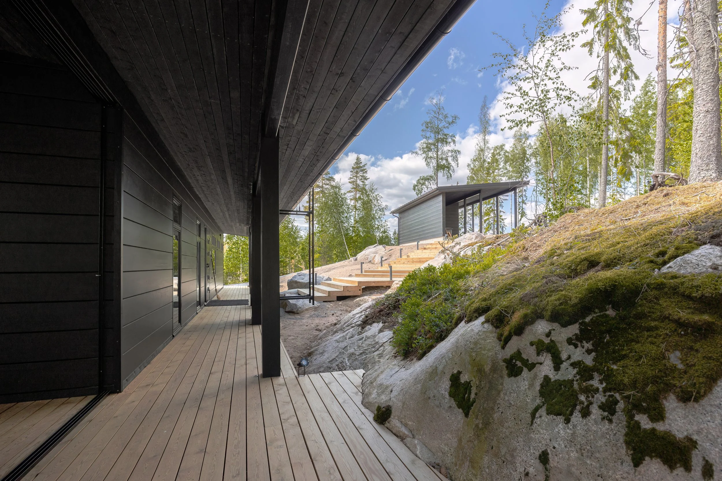 Vapaa-ajan asunnon sisustus oli omaa luokkaansa jonka sisustuksesta on vastannut Inner Sisustusarkkitehdit Oy. Mieleen jäi myös erittäin huolitellut terassilautojen mukailu kalliokiven kanssa.